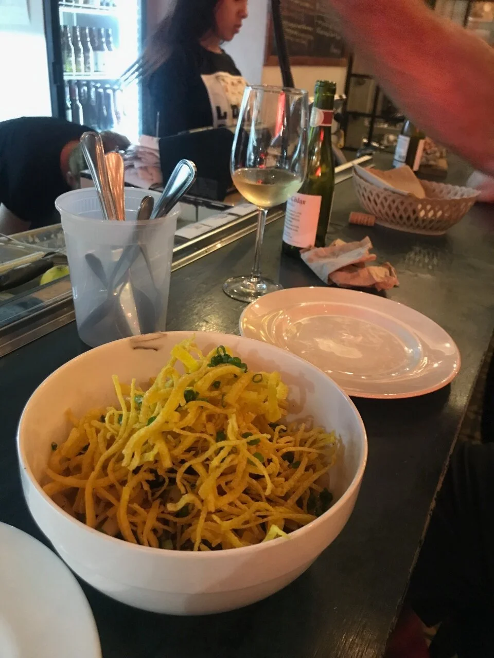 Lo Que Hoy’s Beef tongue with pasta (and something crunchy on top) had a nice spicy edge. We sat at the bar and enjoyed talking with the chef.